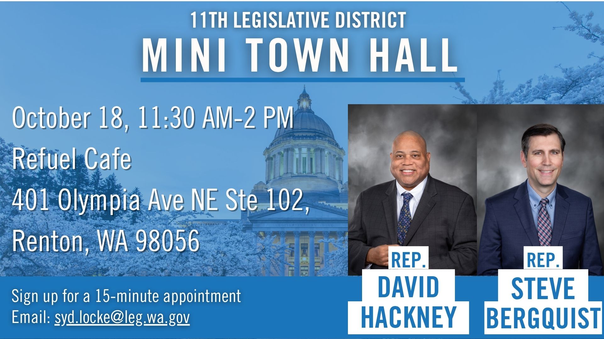 On Saturday, October 18, from 11:30 a.m. – 2 p.m., please join Representative David Hackney and I at Refuel Café (401 Olympia Ave NE, Ste 102, Renton, WA).