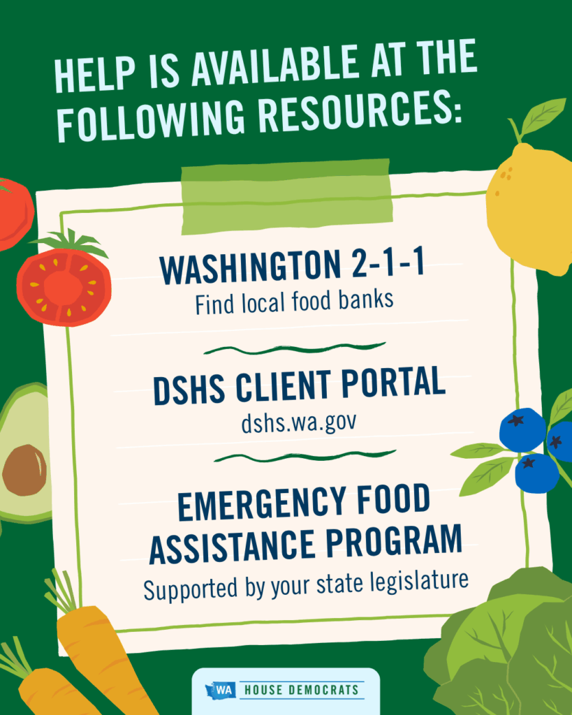 If you receive SNAP benefits or are looking to provide assistance, the Washington Department of Agriculture compiled a database of food pantries throughout the region. If SNAP benefits are completely halted, Governor Ferguson can use funding we passed in the state budget to temporarily boost local food banks.
