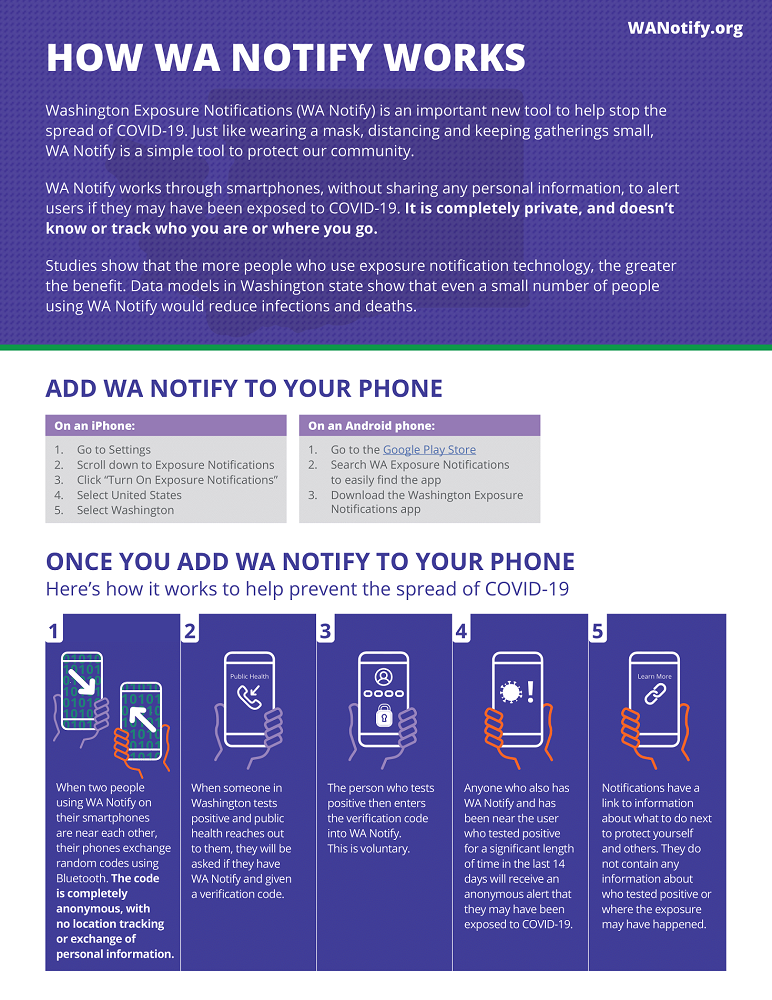 Over 700,000 Washingtonians have already activated WA Notify. In order to maintain anonymity, the app requires a few manual steps to turn on. Please see the graphic below for an explanation of turning the app on. It’s a small step, but one that will play a big role along with mask wearing, handwashing, and staying home as much as possible.
