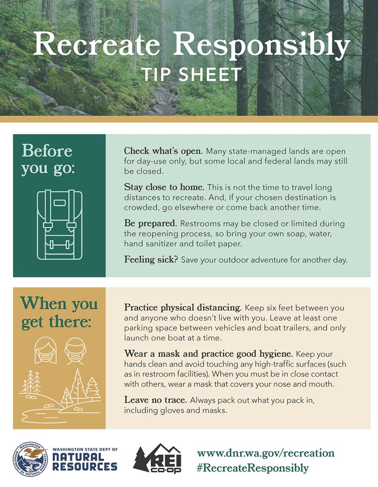 On Monday, Gov. Inslee announced that state recreation lands will partially re-open on Tuesday, May 5. This includes day use of certain state parks, recreational lands managed by the Department of Natural Resources, boat ramps, fish and wildlife areas, hunting areas, and golfing. Golf will be restricted to twosomes unless all four members are immediate family. Seasonally appropriate hunting and fishing seasons will be open. Check DNR’s website for more details.