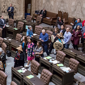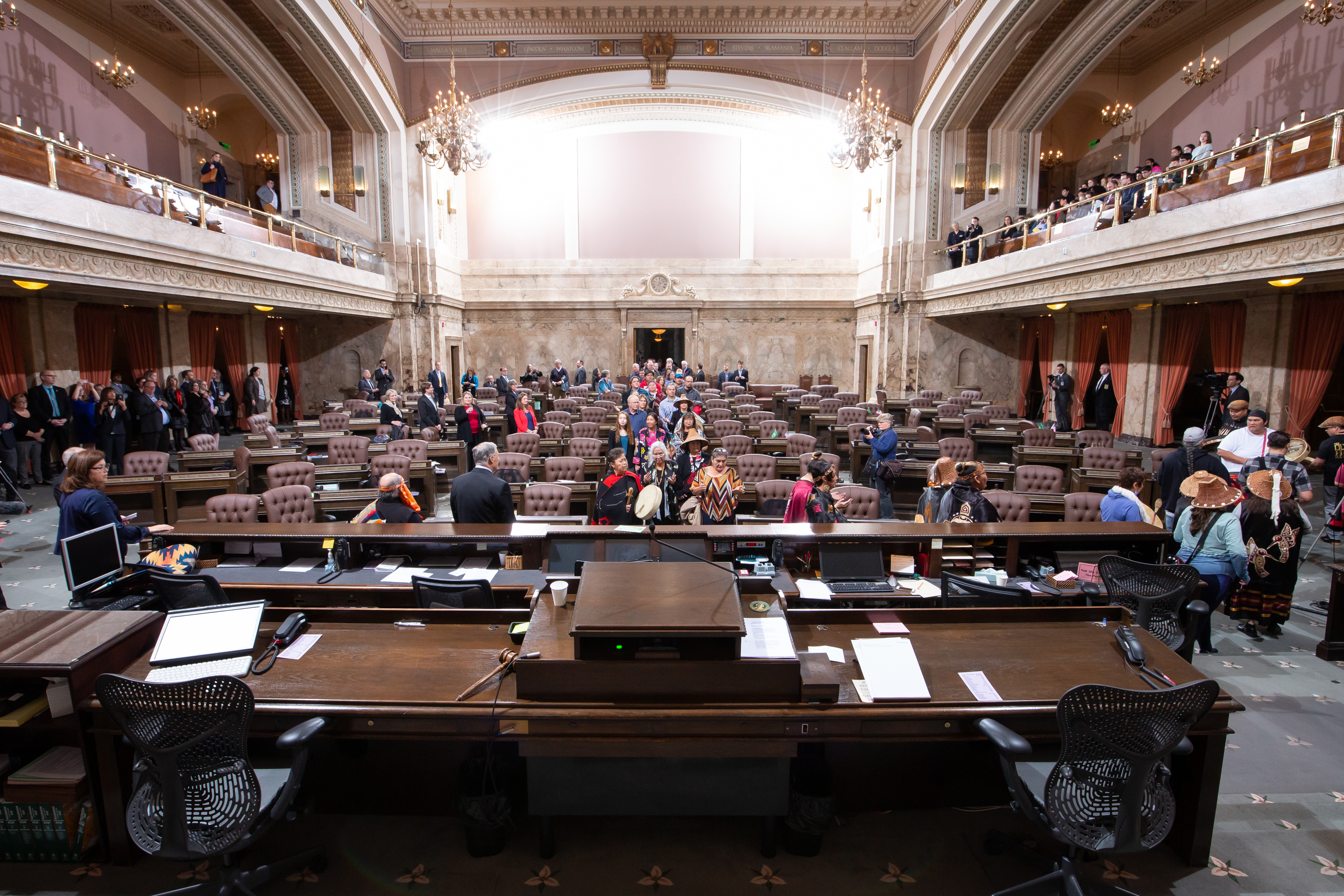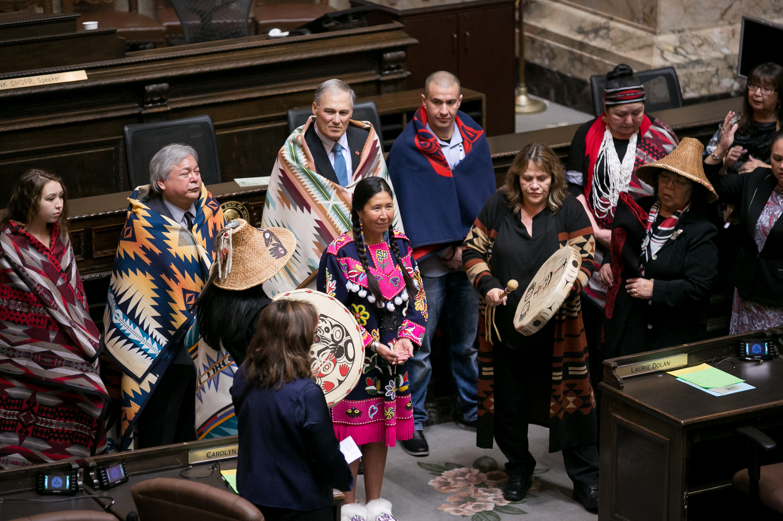 Beyond the typical ceremony where all legislators are sworn into office during the House opening day proceedings, Rep. Lekanoff brought something special to the Capitol. After the closing of the daily proceedings, Rep. Lekanoff was joined on the floor Coast Salish Washington Tribal leaders and British Columbia First Nation Chiefs across Washington, as well as Gov. Jay Inslee, House Speaker Frank Chopp, House Republican Leader JT. Wilcox, and fellow representatives for a tribal blanketing and swearing in ceremony.