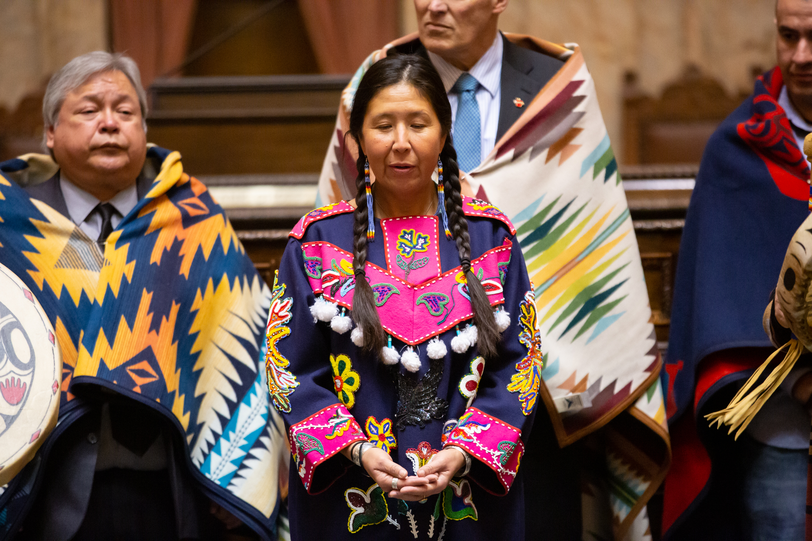 In the Coast Salish culture, it is traditional to wrap a blanket around those witnesses chosen to carry the story forever. Being blanketed is a sign of respect for those who have made a valuable contribution to the community. Governor Jay Inslee, Nisqually Councilman Willie Frank, Sumas First Nation Chief Dalton Silver and Rep. Lekanoff’s daughter Emma Worgum were also official witnesses for the ceremony.