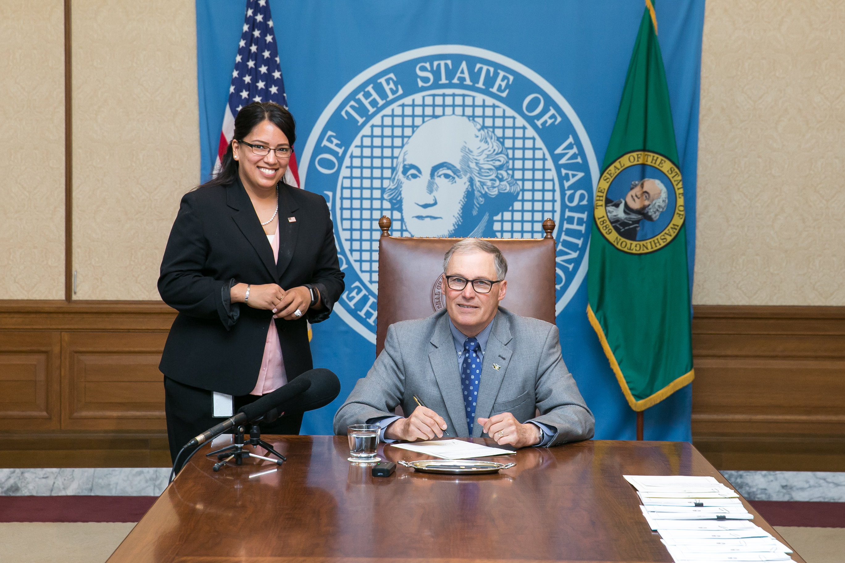 Gov. Inslee signs Engrossed Second Substitute House Bill No. 1802, May 4, 2017. Relating to increasing the access of veterans, military service members, and military spouses to shared leave in state employment. Primary Sponsor: Kristine Reeves